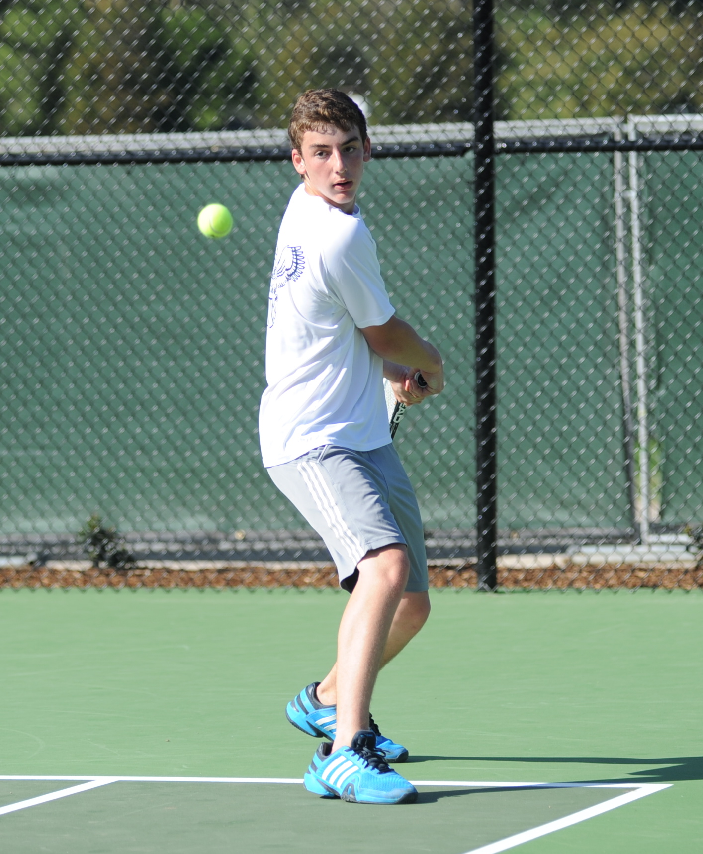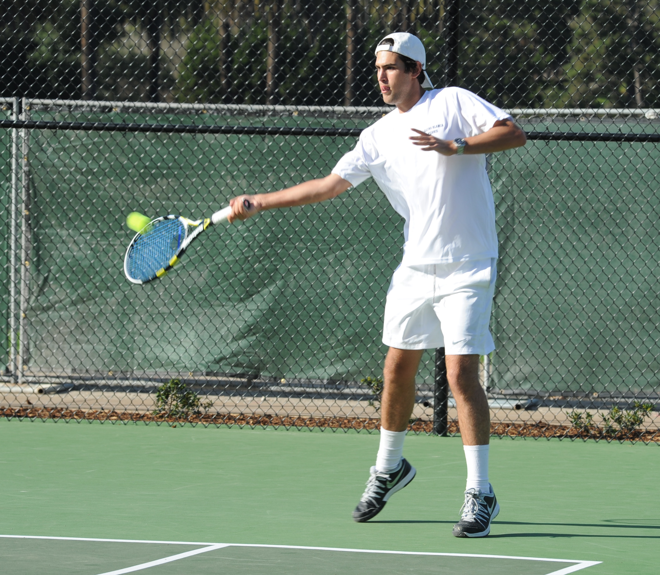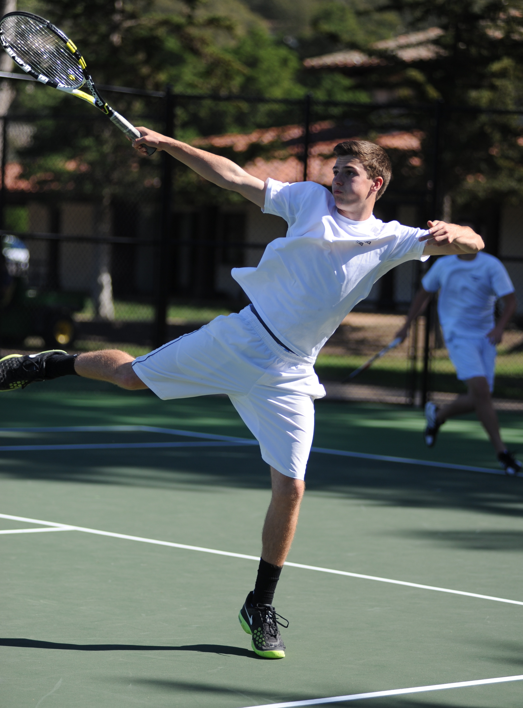 In singles, Ben Furukawa played strongly, but suffered a 6-3 loss against Anthony Baltazar, the Rio Mesa #1 and serious tournament player. Tristan Prinz and Phillip Hicks picked up the slack with 6-0 and 6-1 wins at #2 and #3 singles to put Laguna up 4-2 after the first round.