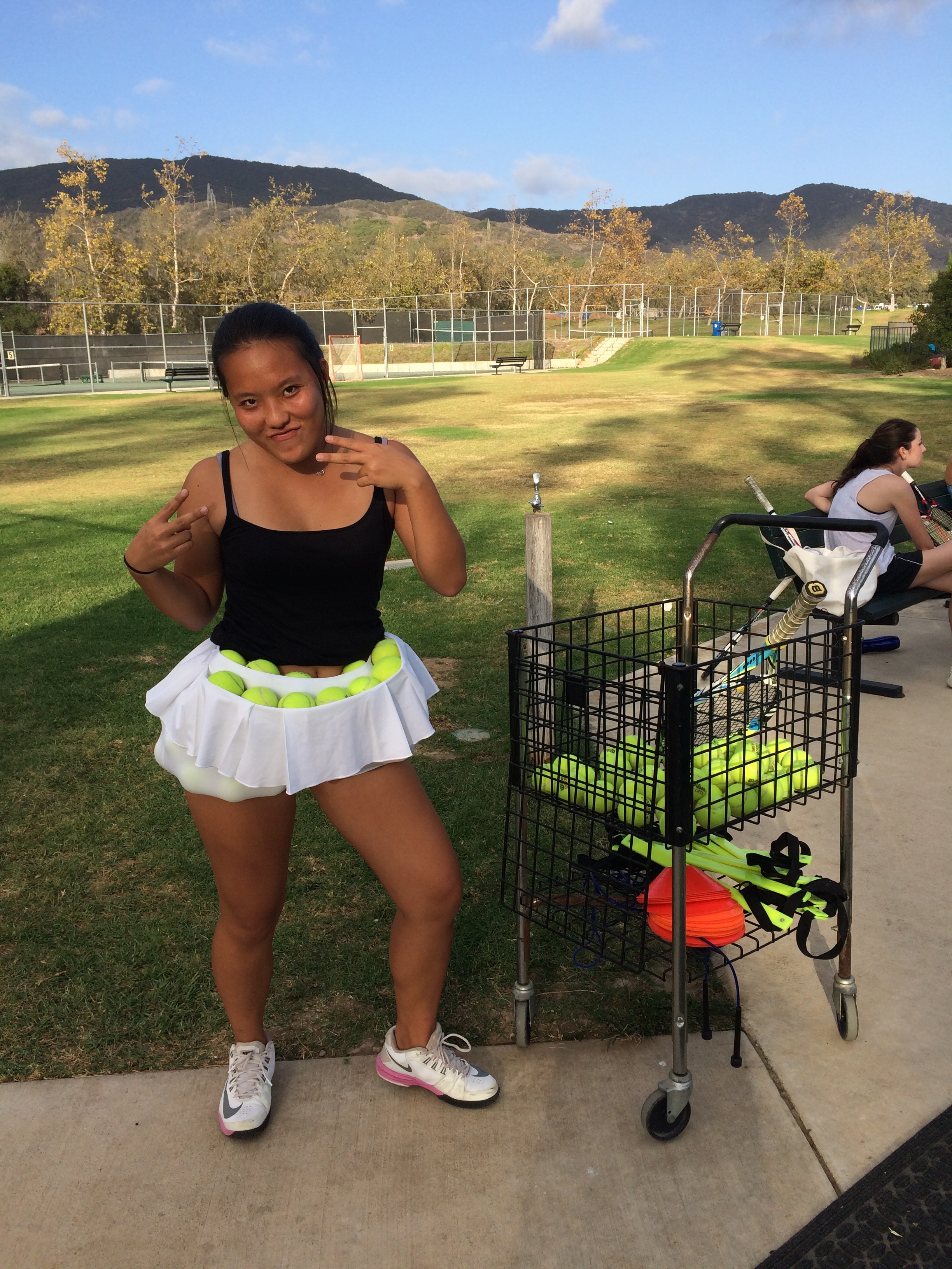 Now, I would be remiss without pointing out another record-holder amongst us. This year, Maki Kobayashi was our lone freshman. She not only improved her tennis game, but also set and then broke the record for most tennis balls held in one’s skirt/shorts. For all you readers, the record stands at 54 balls. Maki is a trained professional. We cannot be held responsible for what happens if you try this at home!