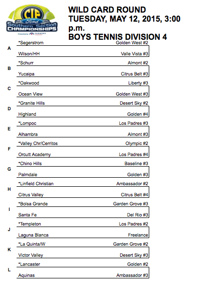 CIF has released the playoff pairings and all-in-all I think it looks promising. Tomorrow, we’ll travel north to Templeton to play the Los Padres League #2 seeds. With a victory, we’ll make the main draw, where Buckley awaits an opponent on Wednesday. Here’s a look at final division seedings and the draws: