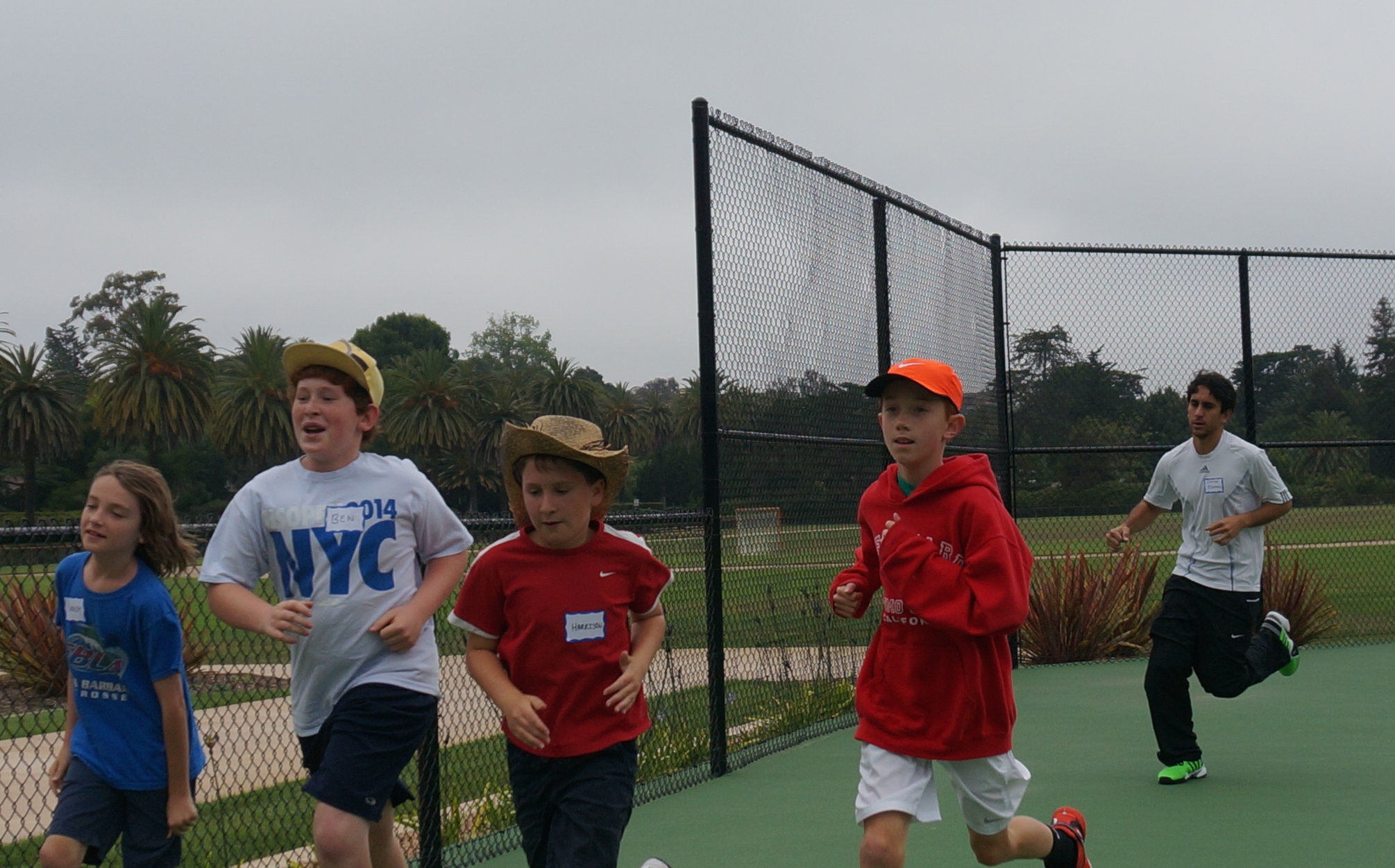 This year, one of the new elements added to enhance the program is a daily “celebrity coach.” Today, it was Justin Vea, a former ITA All-American collegiate player. Here’s a shot of him chasing the back of the pack during our group warmup!