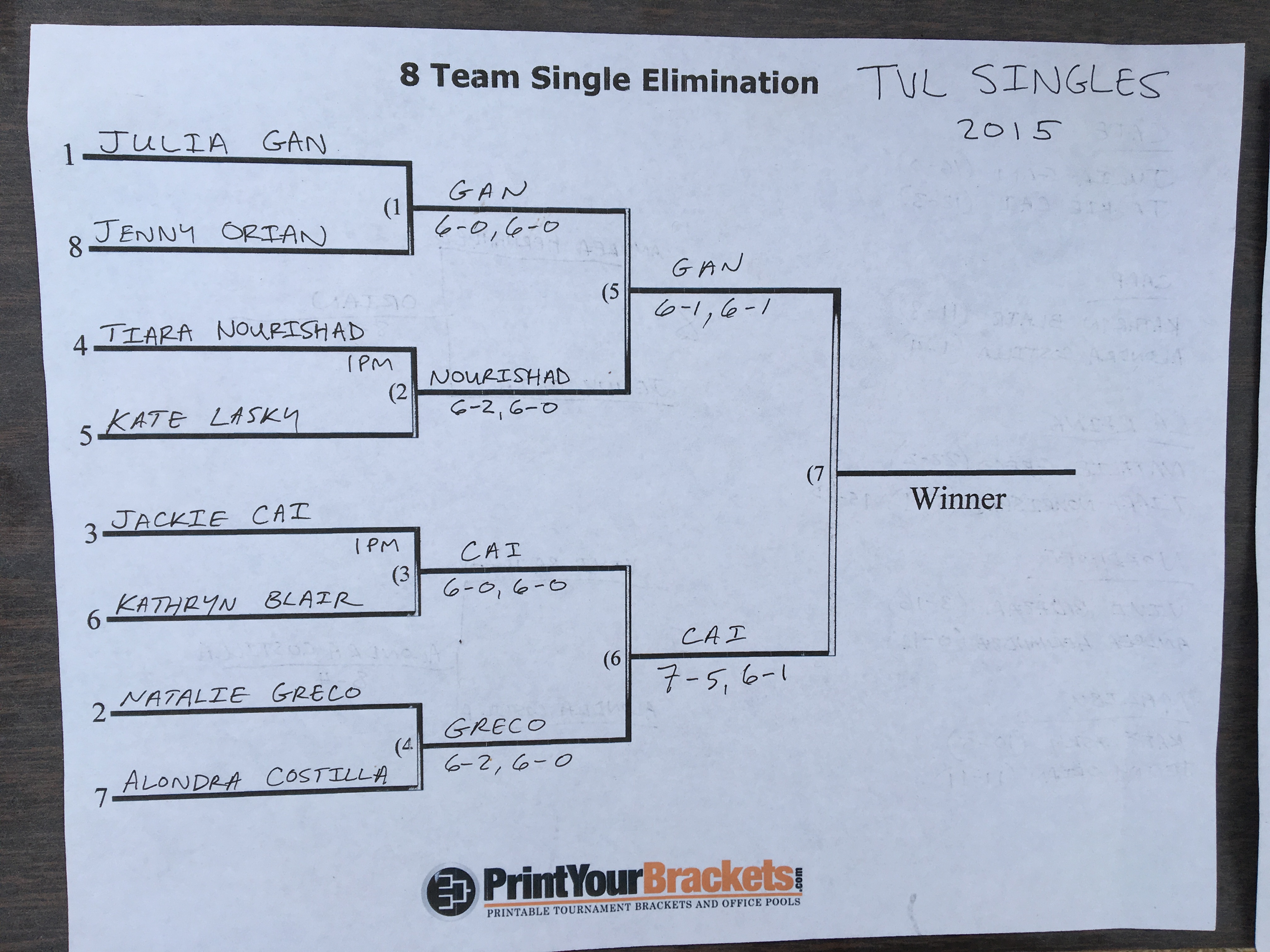 A sophomore, Cai will play her senior teammate (Gan) in an all-Cate final for the TVL singles title on Thursday.