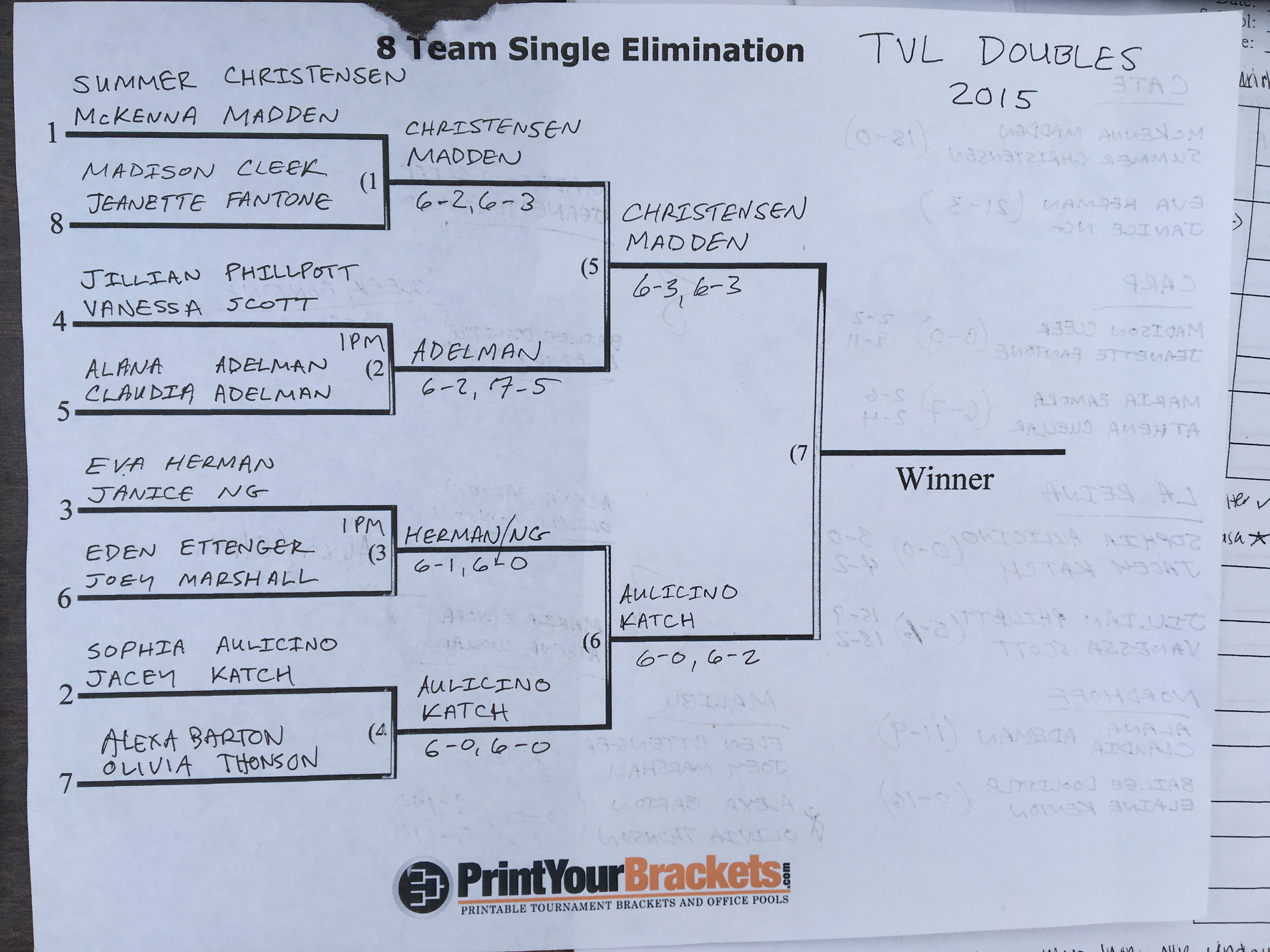 In doubles, it was business as usual for two-time defending TVL Champs Sophia Aulicino and Jacey Katch, who recorded a 6-0, 6-0 win in the quarters and then defeated Cate #2’s Eva Herman and Janice Ng in straight sets.
