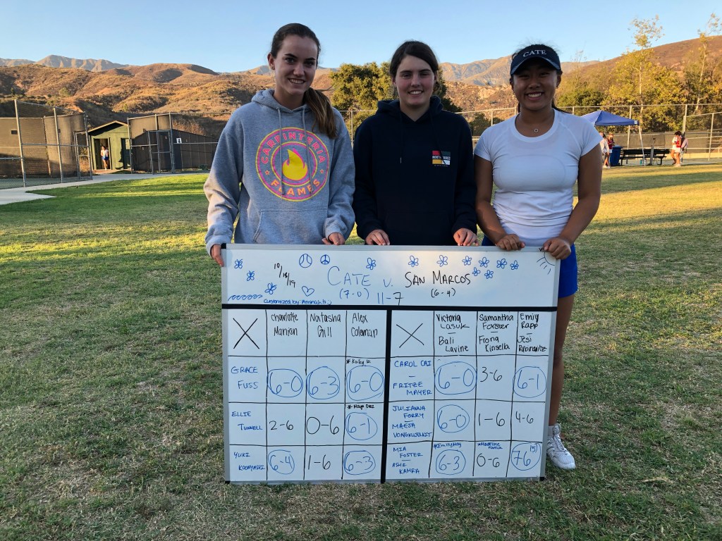 Cate’s underclassmen also provided key victories, with junior Yuki Kobayashi going 2-1 on the day at #2 singles and sophomore Ashi Kamra going 2-1 at #3 doubles. Sophomore Emily May partnered with Kamra in the final round-of-play to defeat San Marcos’s #1 team and clinch the match, while freshman Ellie Tunnell chipped in a win at #3 singles.