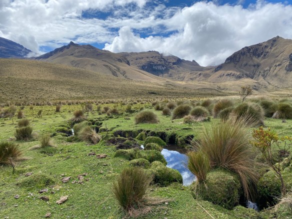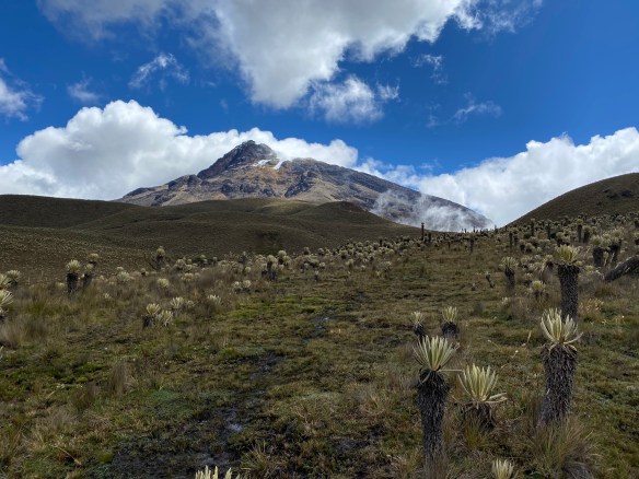 From Valle Cocora, I ventured through 36 miles of jungle, muddy marsh-like plateaus, the rare “paramo del Quindío,” and up to over 14,000 feet of elevation to reach the base of Volcano Tolima, one of three volcanoes in the region. All three were once heavily glaciated, but now one no longer sports its icy top-hat and even Tolima, which reaches up over 17,000 feet into the sky is predicted to be in its last decade or two of glacier lifespan.