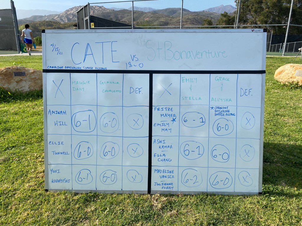 Cate Girls’ Tennis picked up right where we left off, notching a 43rd consecutive league victory over visiting St. Bonaventure High School. The Servons surrendered just six games en-route to a clean sweep victory.