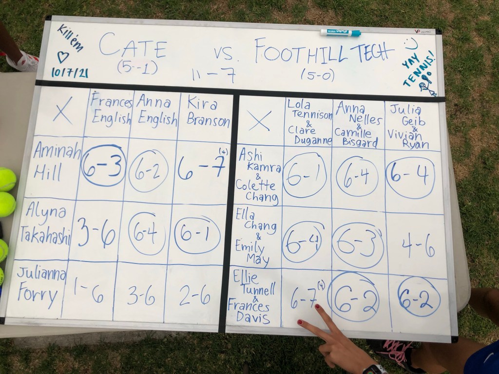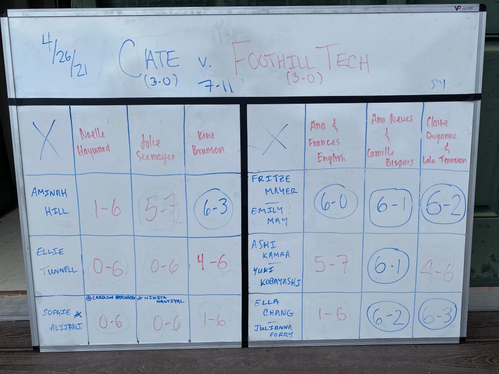 In doubles, Foothill returned their two-time defending league champion doubles team and Cate was unable to break their unbeaten streak. Cate fared better at the other two doubles positions, with Reyna Takahashi/Sophie Alijani and Caroline Batchelder/Elsie Chamberlain both taking two wins. New freshman combo Gwendi Rogers and Sophie Blank added a win and battled to a 4-6 set against the Foothill Tech #2 team.