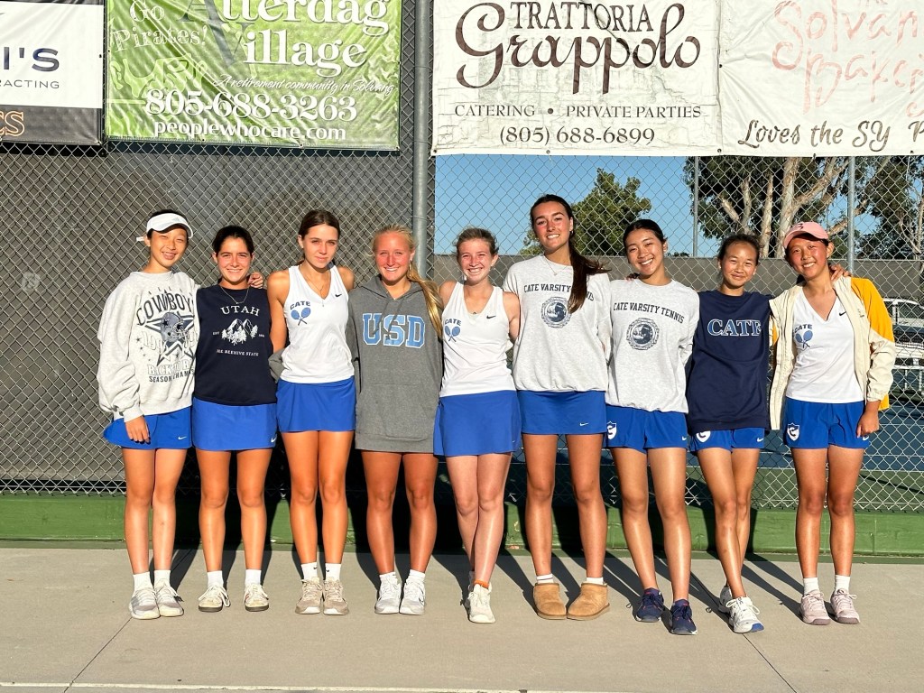 Cate Girls’ Tennis defeated the Santa Ynez Pirates to remain unbeaten on the season. The non-league match was played using the CIF Central Section format, similar to that of NCAA tennis, featuring 3 doubles teams contesting an 8-game pro-set, before a round of 6 singles players hit the courts for a 2-of-3 set match. In the end, despite a strong challenge from the Pirates, particularly in doubles, Cate rolled to an 8-1 win.