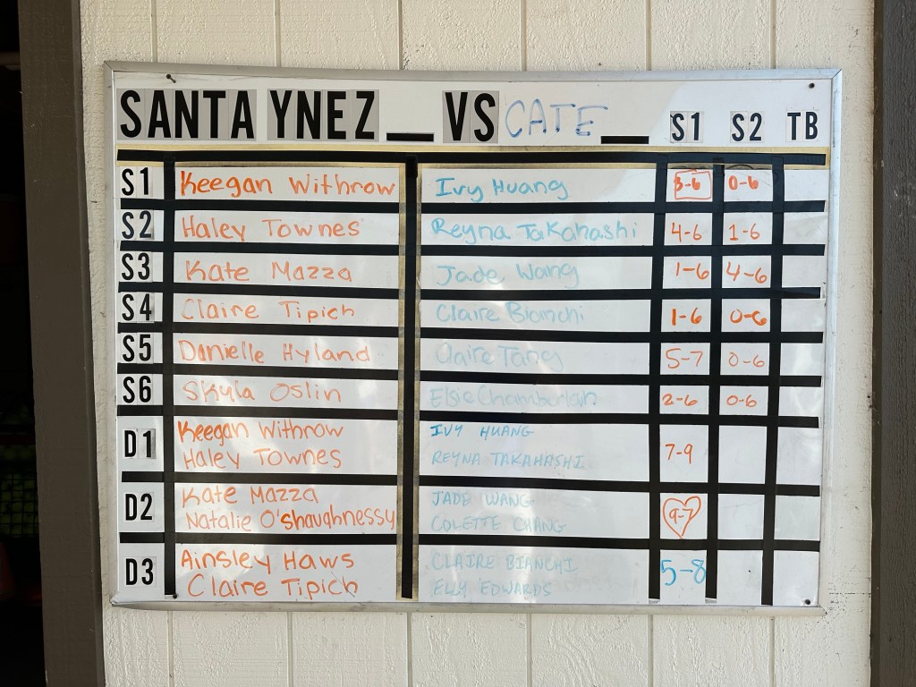The match began with very even doubles play from both teams, with Cate holding a slight edge at #2 and #3 doubles and Santa Ynez leading in the early-going at #1.