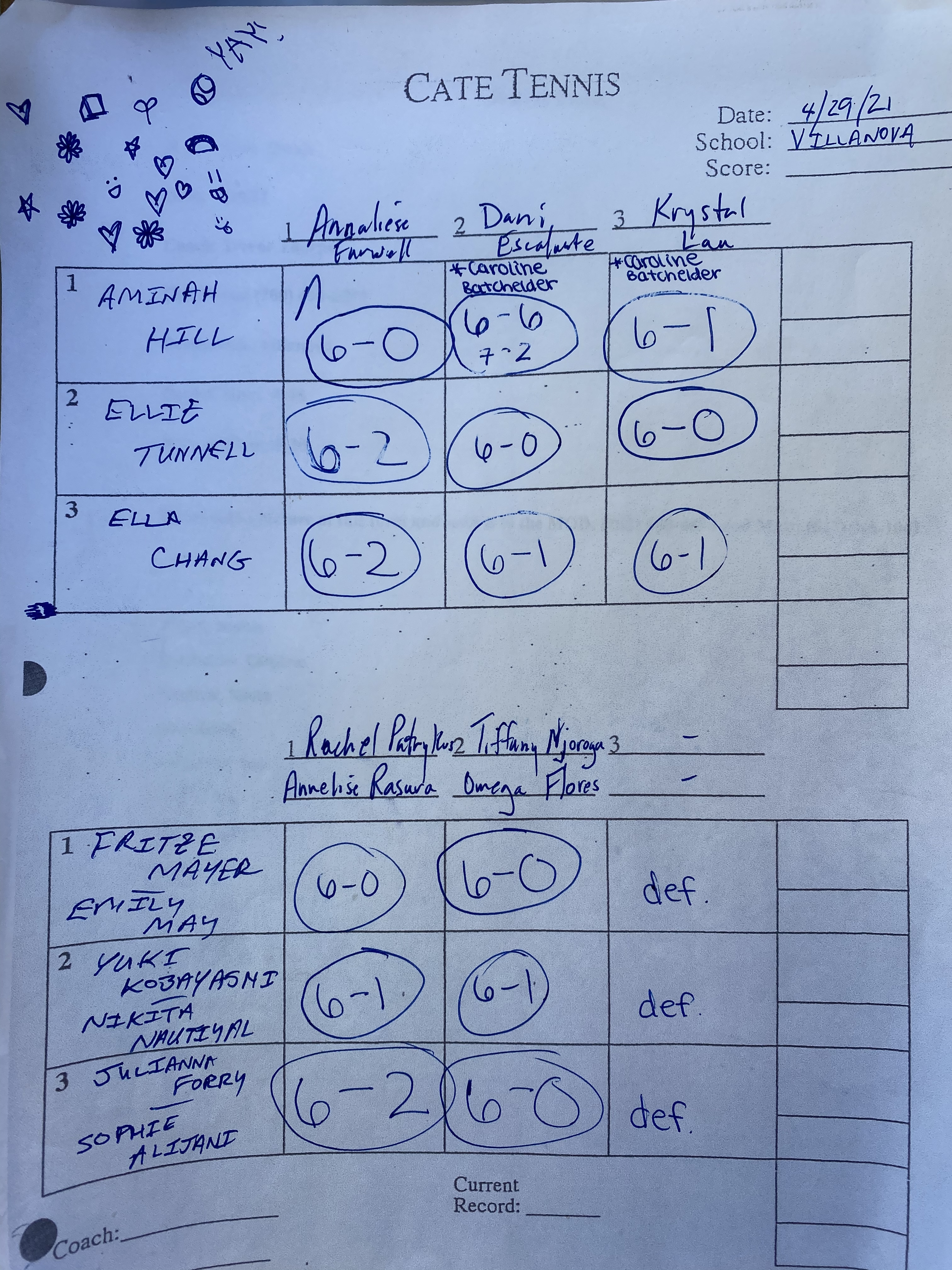 Mayer and partner Emily May continued their unbeaten streak this season (13-0) without dropping a single game. Kobayashi partnered with Nikita Nautiyal at the #2 spot and Julianna Forry and Sophie Alijani played #3 in what was a 9-0 doubles win for the Servons.